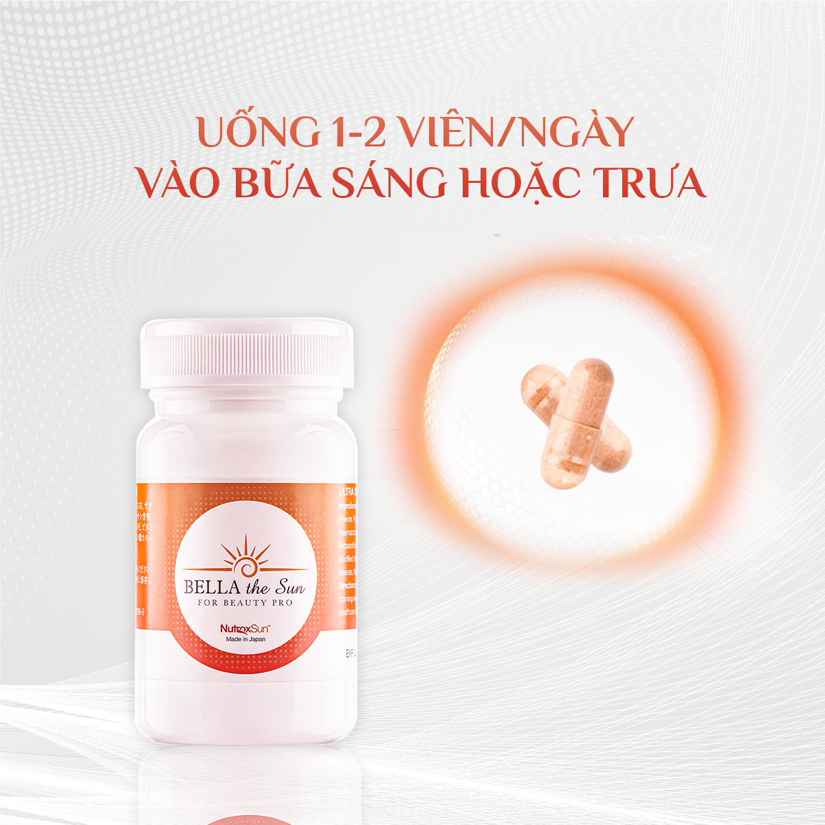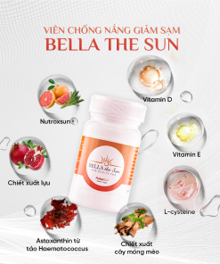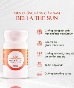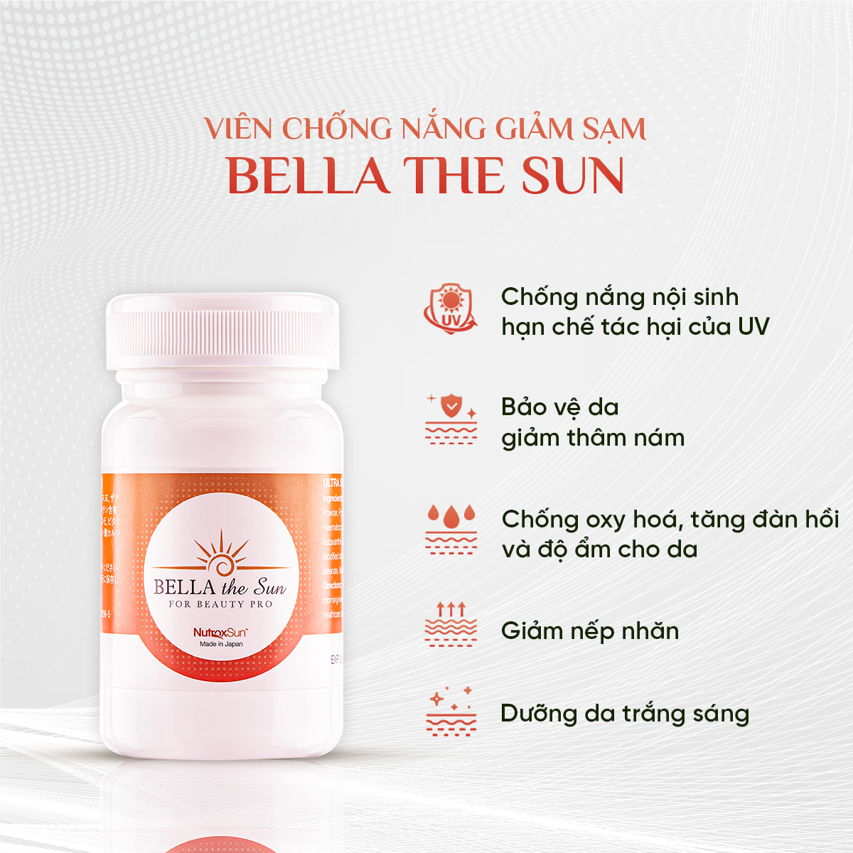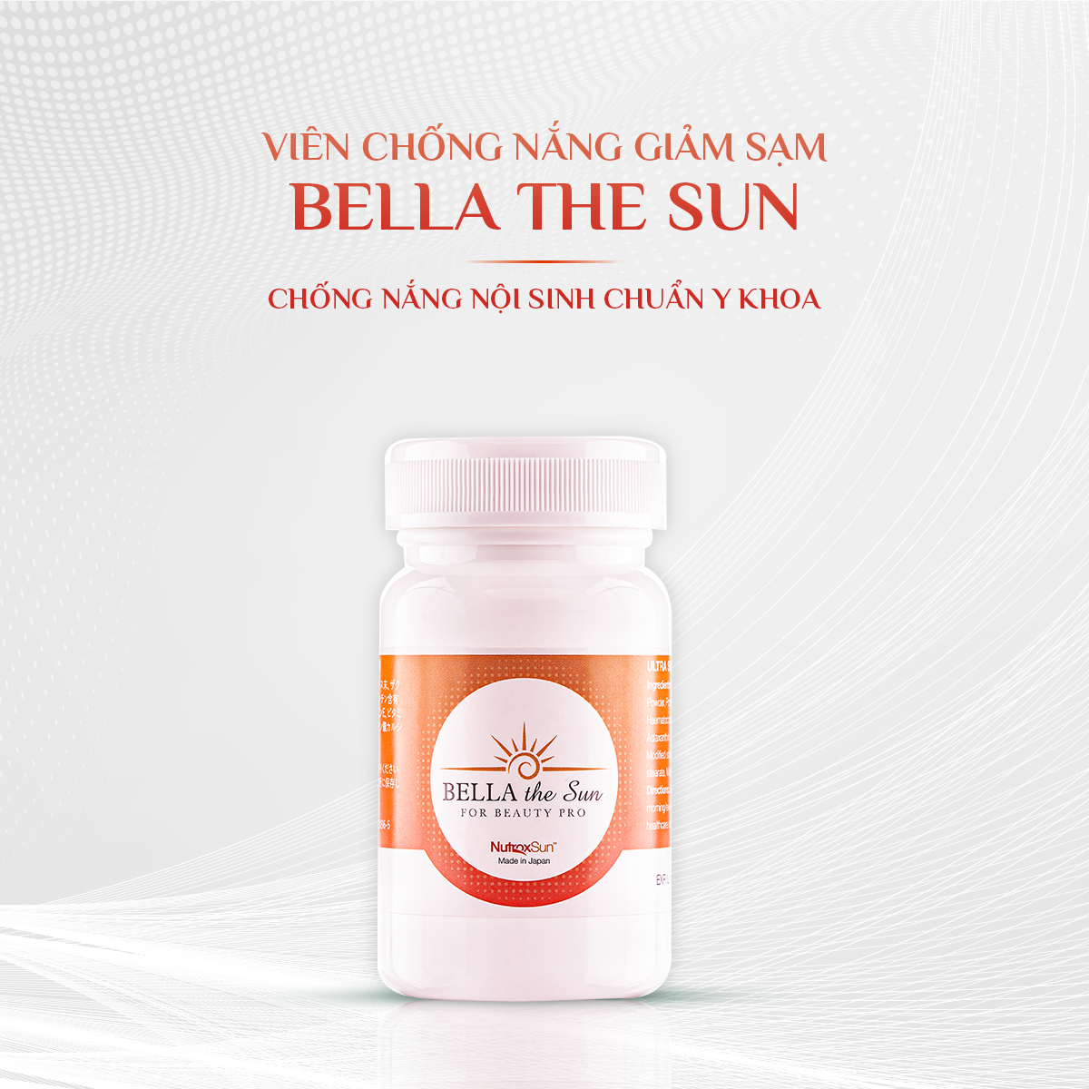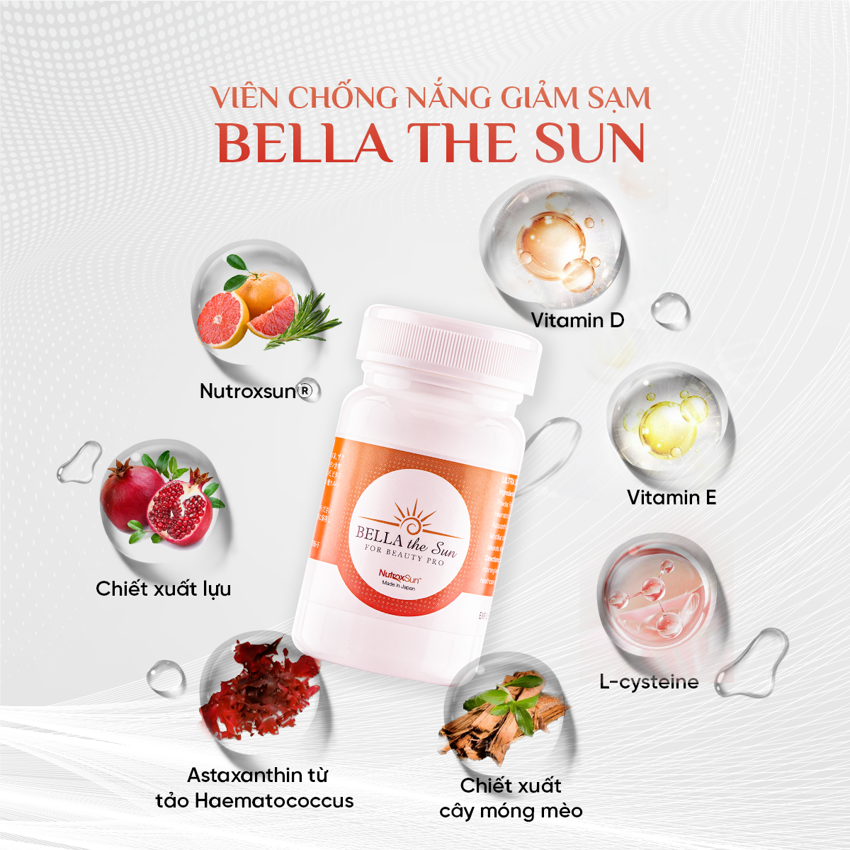 Viên uống chống nắng nội sinh giảm nám Bella the Sun với chiết xuất 100% tự nhiên từ cam đỏ và hương thảo có hàm lượng chất chống oxy hóa cao nhất của vùng Địa Trung Hải, tạo nên phức hợp Nutroxsun® được nghiên cứu lâm sàng và cấp sáng chế về chống nắng nội sinh duy nhất trên thế giới. Công thức độc quyền bảo vệ da toàn diện trước tia UV và tác nhân stress oxy hóa gây nên đốm sạm màu, nếp nhăn. Kết hợp cùng astaxanthin từ vi tảo đỏ Nhật Bản, chiết xuất hạt lựu giàu polyphenol và L-cysteine, Bella the Sun giúp da chống lại tác hại của tia UV, giảm thâm nám, duy trì độ đàn hồi và tươi sáng rạng rỡ.